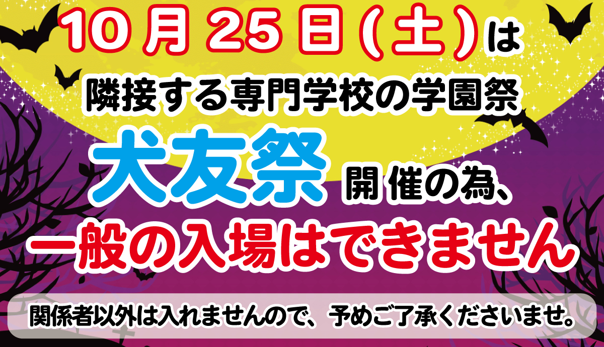 10/25(土)は隣接している「つくば国際ペット専門学校」の学園祭 【犬友祭】開催の為、一般の入場はできません。 関係者以外は入れませんので、予めご了承下さいませ。 -