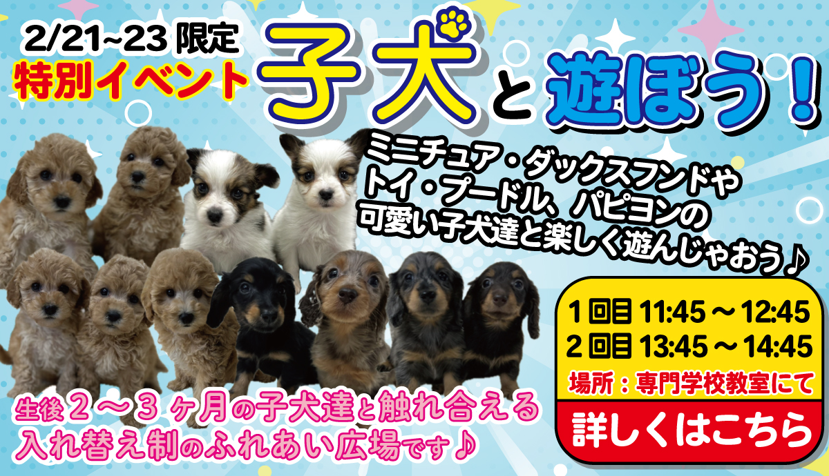 ゴールデンウィークの情報をアップしました! ゴールデンウィーク期間(4月27日、29日、5月3日~6日)は 「つくば国際ペット専門学校」の講師によるイベントや 子犬とのふれあいイベントなど盛りだくさんとなっております! … Continue reading -