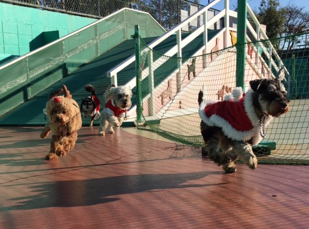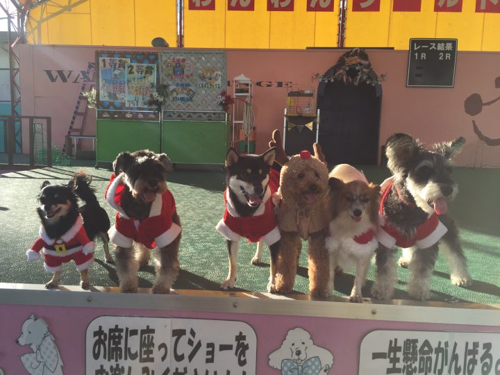 サンタわんこに混じって1頭だけトナカイさんの衣裳のわんこが主役のレースショー!