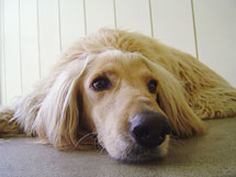 2006年3月レオ君5才です。何犬でしょう?わんわん展示館にいる、ロン毛がお似合いのレオ君。 犬種はアフガン・ハウンドです。散々遊んだあとのちょいとお疲れの表情です。 うれしいと直角的な動きをしてはしゃぎます。
